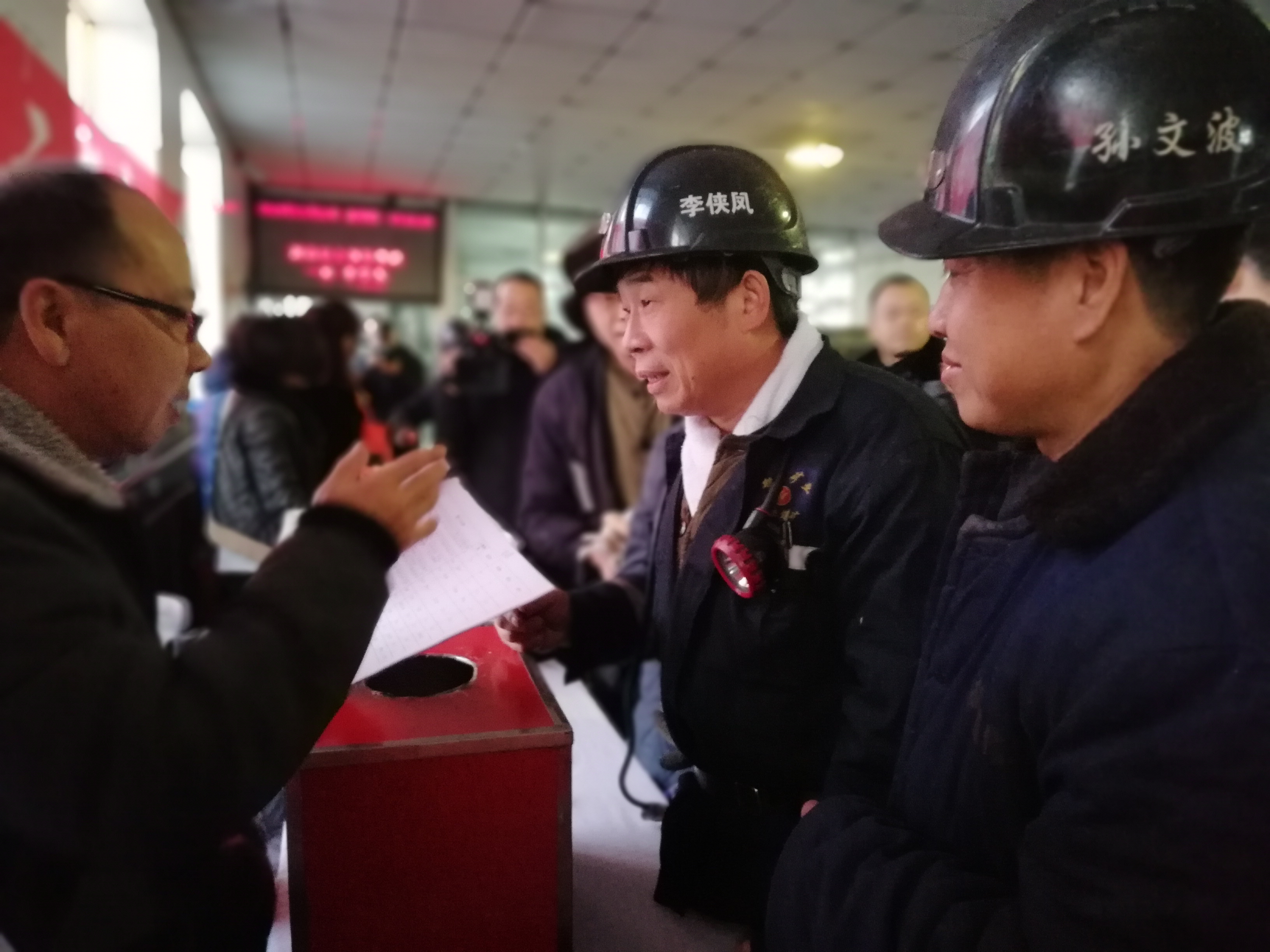 安全警示教育日活动当天,新陆矿组织相关部室人员深入到矿井口联合体,为升入井的职工发放苹果、鸡蛋等慰问品,还将“E课堂”安全知识编排成答题内容,开展安全知识有奖问答。图为职工踊跃参与安全知识答题。王满昌 摄