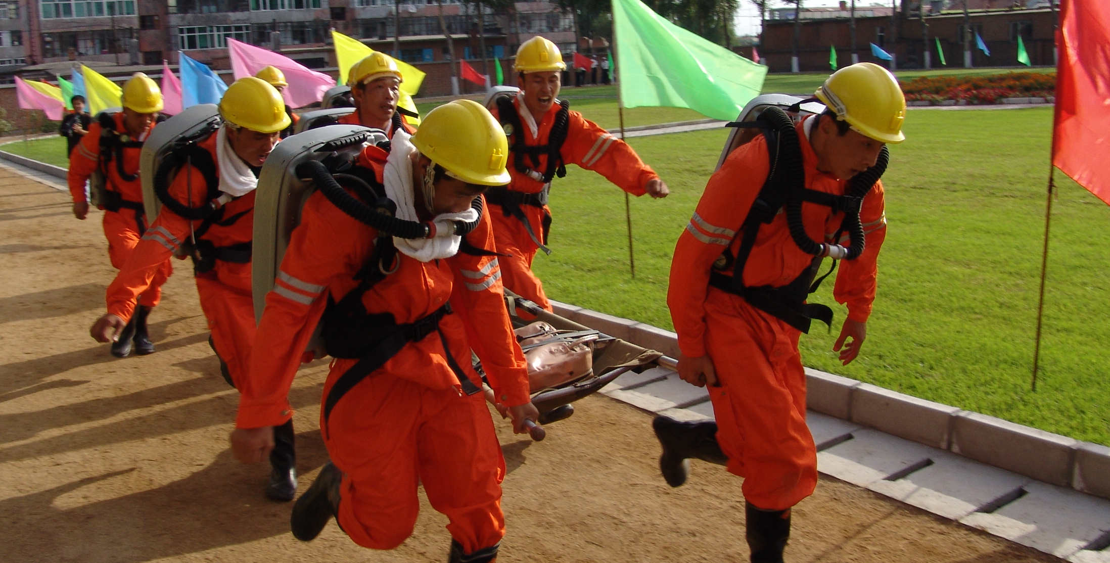 此外,救护队还进行模拟化实战演练,模拟困难条件下开展侦察、探险、寻找搬运遇难人员、医疗急救、挂风帐、砌砖闭、爬矮巷、拆除密闭、清理作业现场等实践操作训练,确保能在发生事故时快速、准确、及时、有效地完成各种急、难、险、重救援任务。