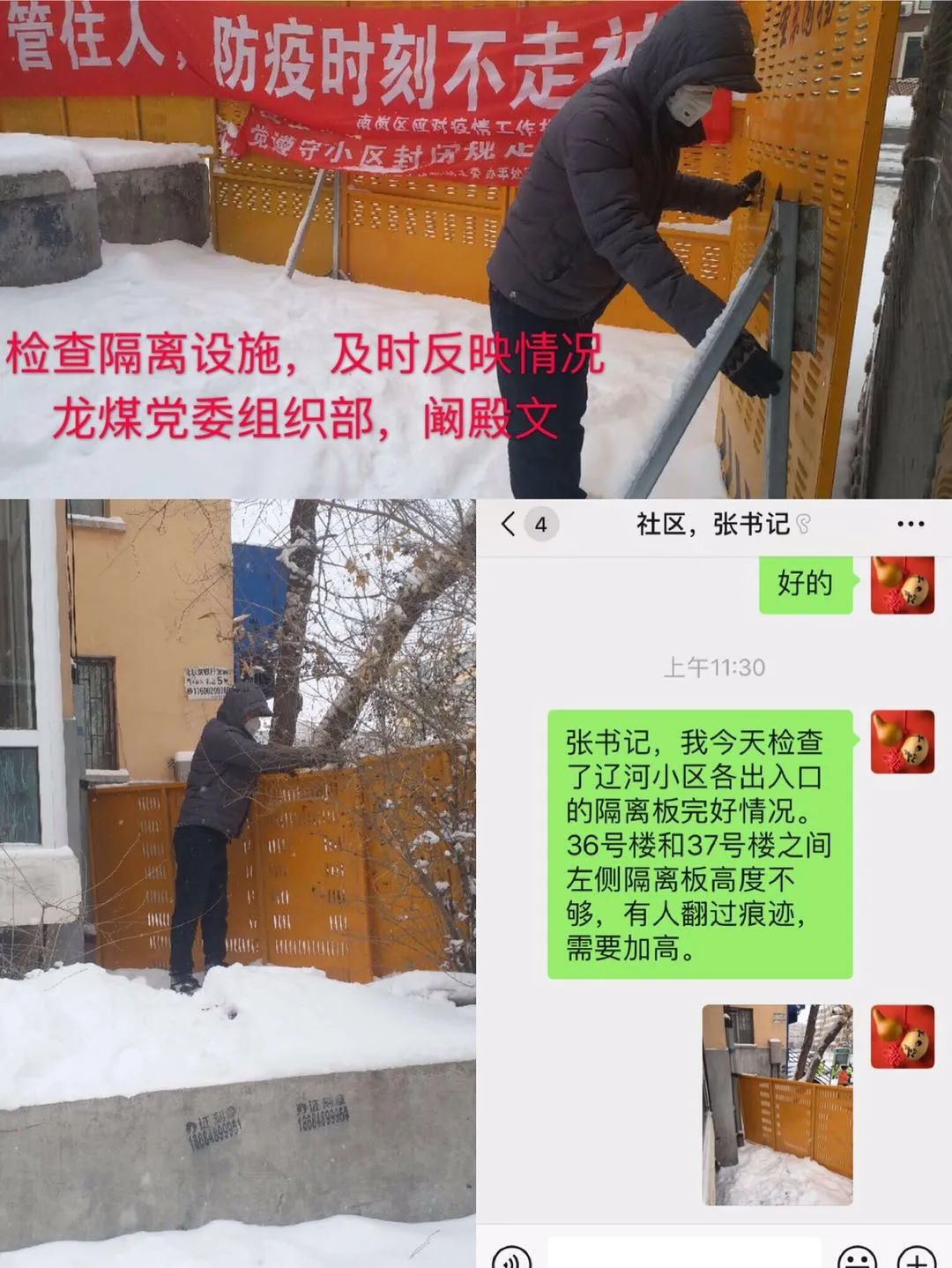 集团党委组织部科长阚殿文在没有接到下社区通知前,就已经成为了社区防控疫情的一名志愿者,“在社区防疫一线上做点事,我心里舒服。”这是阚殿文在南岗区辽河小区协助防控疫情以来说得最多的一句话,“把每一项防疫工作做实做细”是对他最好的诠释。他主动配合社区人员建立了微信群,及时宣传疫情防控知识,每天统计小区居民体温信息,协助社区将《小区管理人员使用手册》的操作要求生成二维码,为防疫宣传助力。他每天查看小区8个封闭口隔离板的完好情况,建议社区加大了隔离板的高度,劝解拾捡废品的老人戴上了口罩。那里需要人手,都派他去救急,站岗登记、张贴通知、上门发放通行证和乙醇消毒液等工作都是他的活。当他得知37号楼一单元住着一位残疾老人,行动不便,他上门送通行证、消毒液,经常帮老人扔生活垃圾,得到了小区居民的一致好评。
