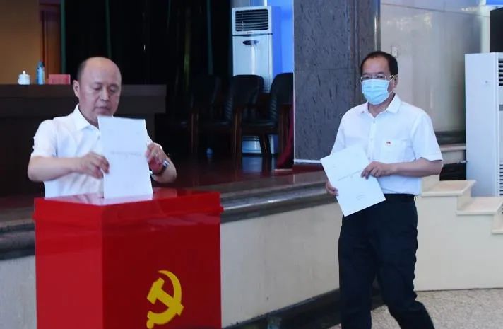 七台河矿业公司党委书记、董事长张长山,党委副书记、总经理刘金奇向投票箱投“四合一”考核民主测评票
