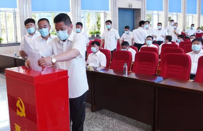 七台河矿业公司领导班子成员及部分中级管理人员按序向投票箱投“四合一”考核民主测评票(摄影 刘广军)
