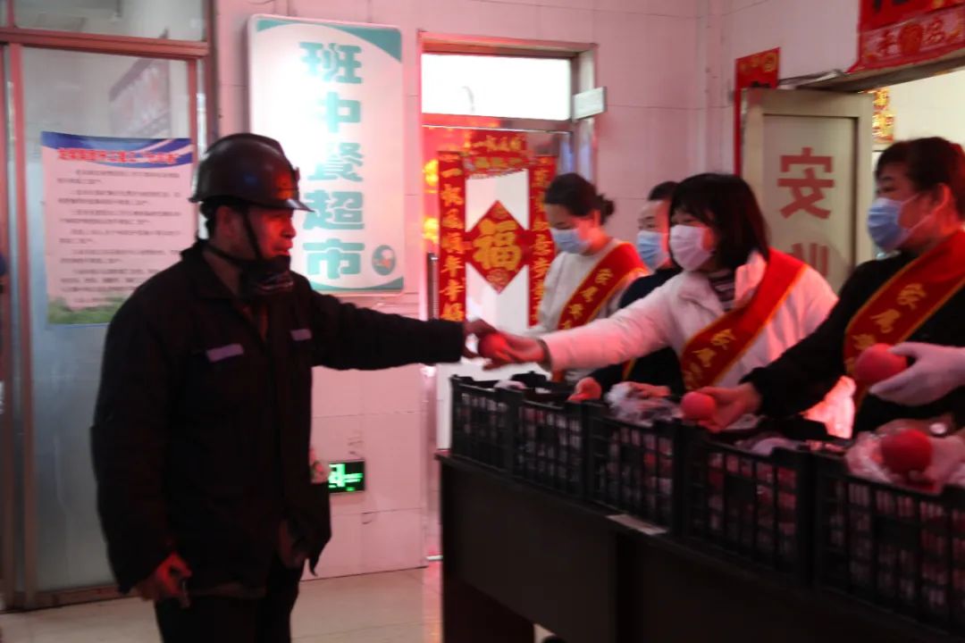 在活动现场,新安矿党政领导和女工委负责人、家属协管员们一起为入井的职工发放平安果,“新年快乐,注意安全”的声声祝福与一个个红彤彤的苹果,带着温暖送到职工的手中。