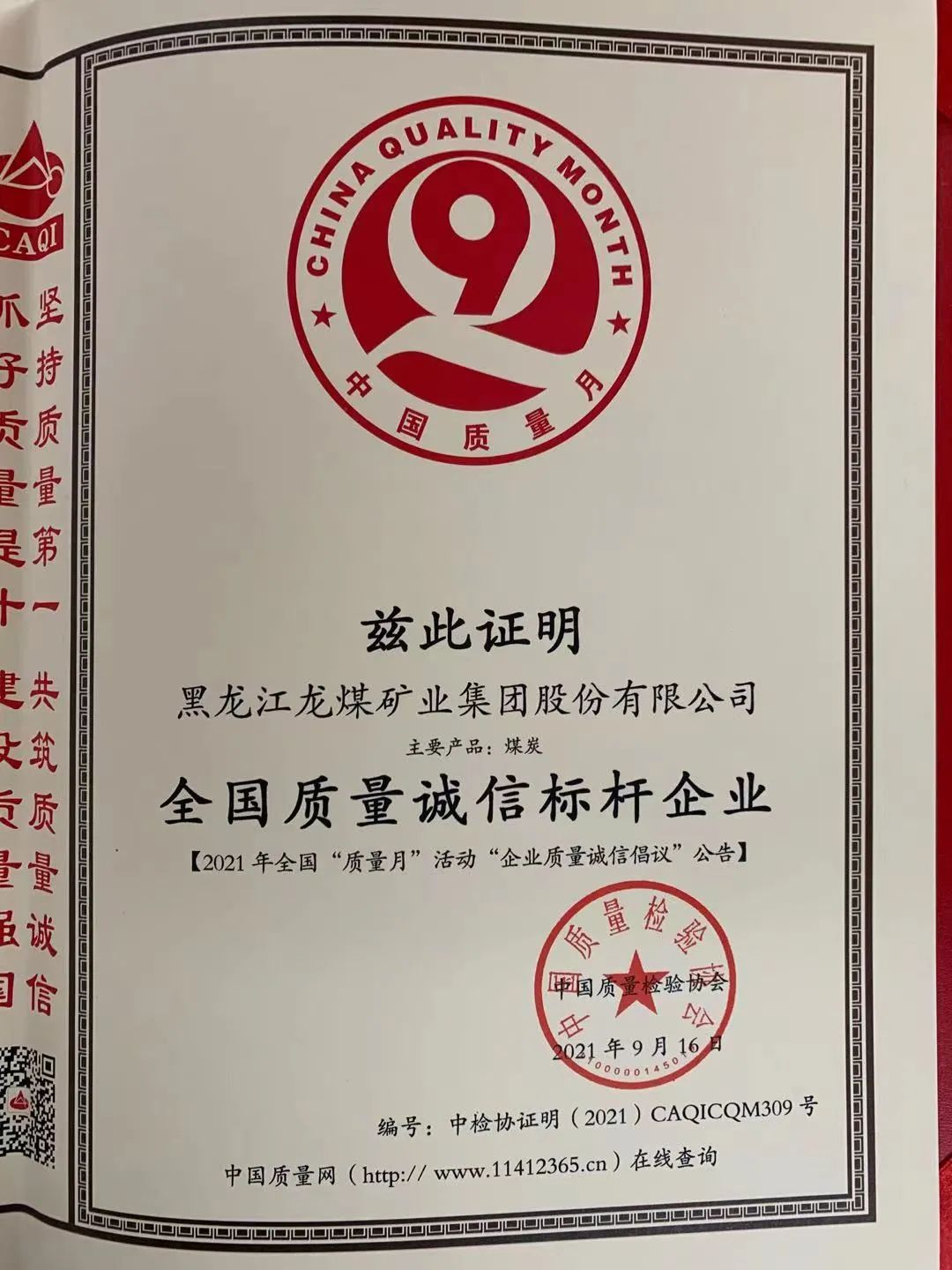 集团公司在中国质量检验协会举办的《2021年全国“质量月”企业质量诚信倡议》专题活动中,获得了“全国质量诚信标杆企业”称号。