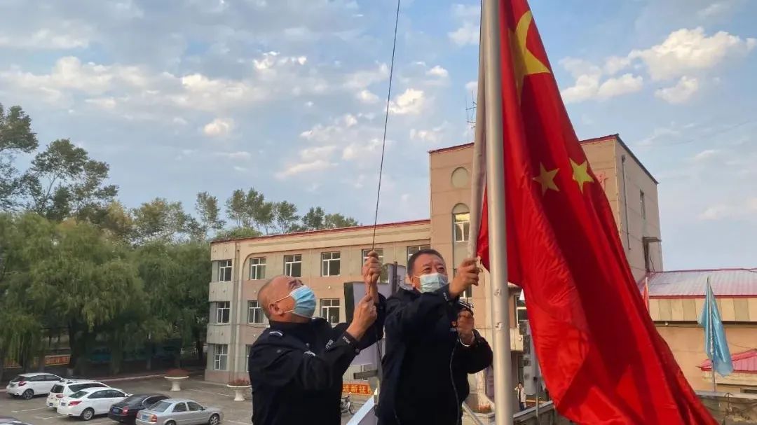图为:武保科干警吴德才、王晓峰庄严地升起五星红旗