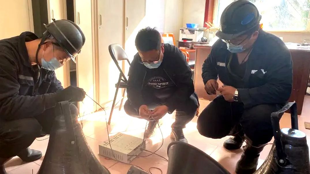 图为:监测队机电副队长谷鹏带领维修小分队抢修通讯设备