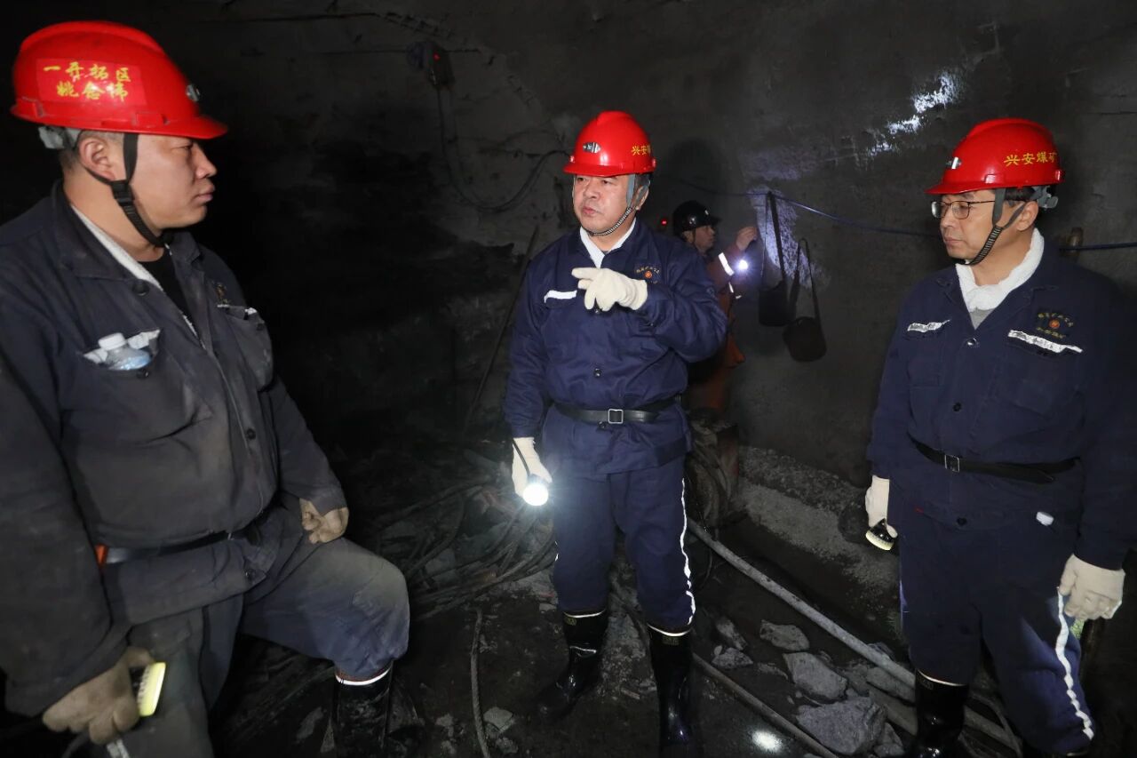 在兴安矿516开拓队工作面,张忠波听取了当班安瓦员的岗位汇报后,详细询问了该队人员配置、机械化设备应用、月进尺情况等具体工作,并结合现场地质构造条件,对安全生产标准化动态达标情况进行了全面检查。他强调,要锚定打造安全高效开拓队伍目标,积极探索使用新材料、新技术,持续提高进尺能力;要优化劳动组织,强化各工序间的衔接配合,切实提高工作效率。开拓工作面必须按相关规定,施工前探地质钻,要以定向钻机替代普通钻机进行前探钻孔施工,最大限度降低钻孔作业对生产连续性的影响。