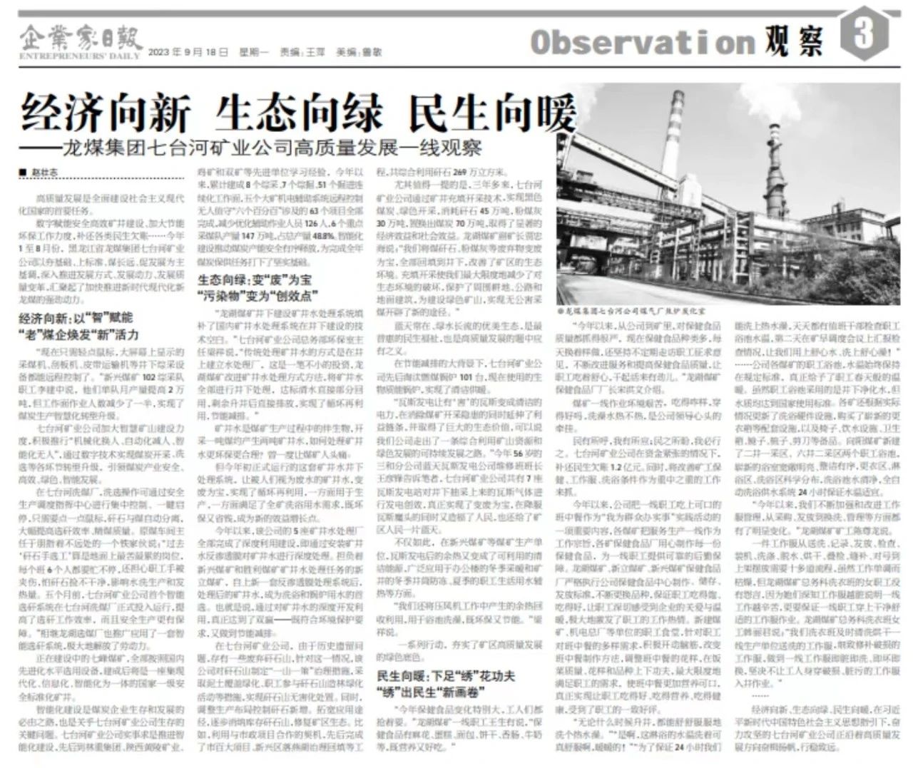 经济向新 生态向绿 民生向暖 ——龙煤集团七台河矿业公司高质量发展一线观察