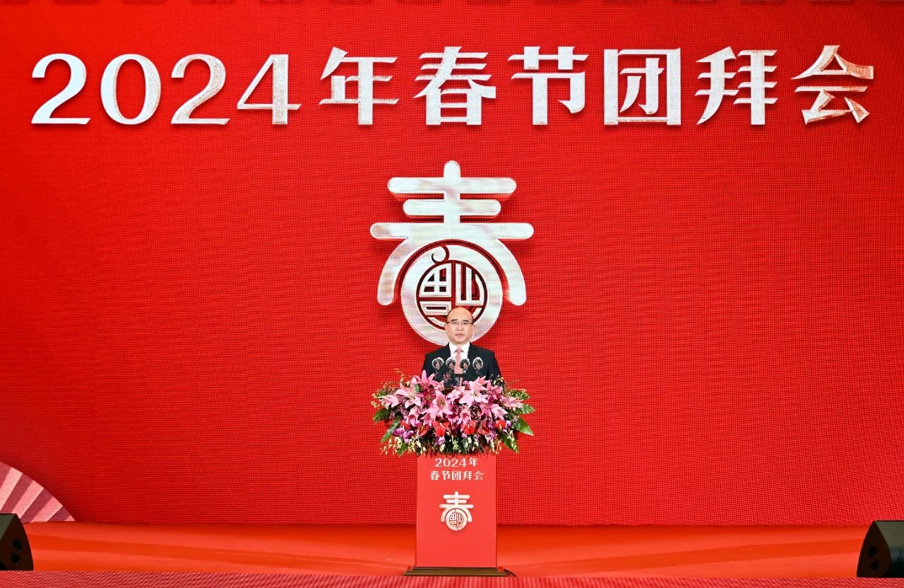 哈尔滨华旗礼堂内各界人士欢聚一堂,互致新春问候,现场洋溢着欢乐祥和的节日氛围。
